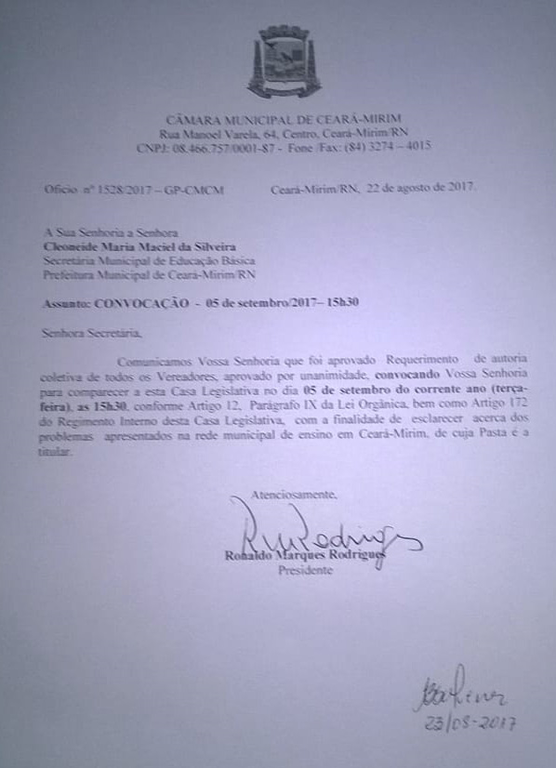 A Câmara de Vereadores de Ceará-Mirim expediu ofício de nº 1528\2017 datado em 22 de agosto de 2017 e tendo seu recebimento na Secretaria Municipal de Educação em 23 de agosto do ano em curso, cujo assunto se trata da convocação da representante da referida secretaria Cleoneide Maria Maciel da Silveira a se fazer presente na sessão que será realizada em 05 de setembro de 2017 a partir das 15h, visto que o motivo seja o repasse das informações e situação da educação do município, bem como a solução dos problemas ocasionados a não resolução dos problemas nesses oito meses da nova gestão.